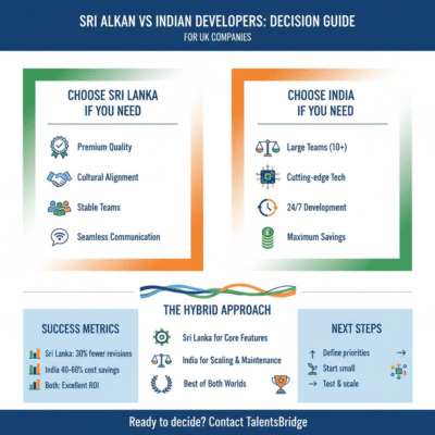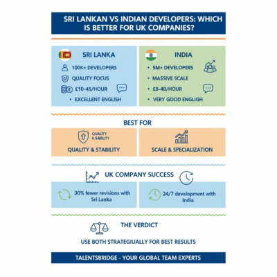 Ready to find the perfect development team for your UK company? TalentsBridge specializes in connecting UK businesses with pre-vetted developers from both India and Sri Lanka, ensuring you get the right fit for your specific needs.